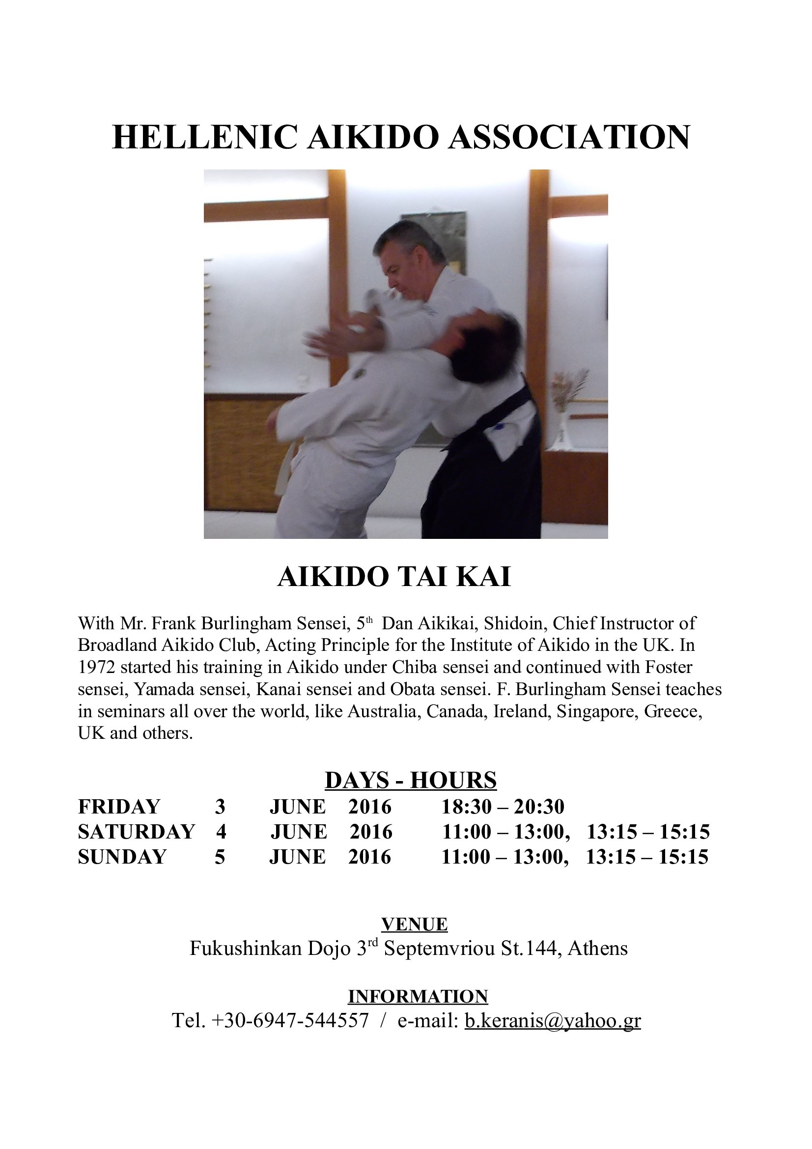 The Hellenic Aikido Assosiation organized in Fukushinkan Dojo, an Aikido Tai Kai with Sensei Frank Burlingham Shidoin, 5o Dan Aikikai, Chief Instructor of the Broadland Aikido and Acting Principal of the Ιnstitute of Aikido UK.